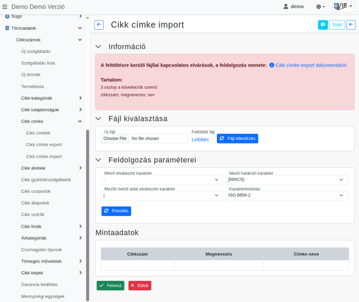 A cikk címkék importálását a Törzsadatok → Cikkszámok → Cikk címke → Cikk címke import