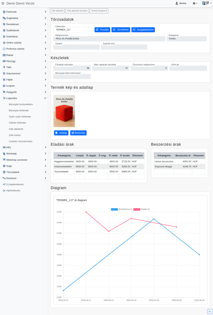 A kiválasztott cikk bevételezési és eladási árának összehasonlítása grafikonon.