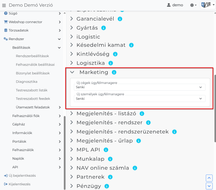 - a Marketing fülre kattintva az eVIR rendszer marketing modulhoz kapcsolódó beállításait lehet elvégezni.