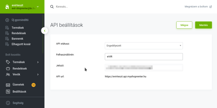 Az itt található beállítások alapján kell az eVIR-ben a Shoprenter beállításokat megadni a