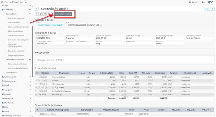 A Szerződés menüpont alatt található listák egyikéből kiválasztott szerződésre kattintva a szerződés adatai láthatók.