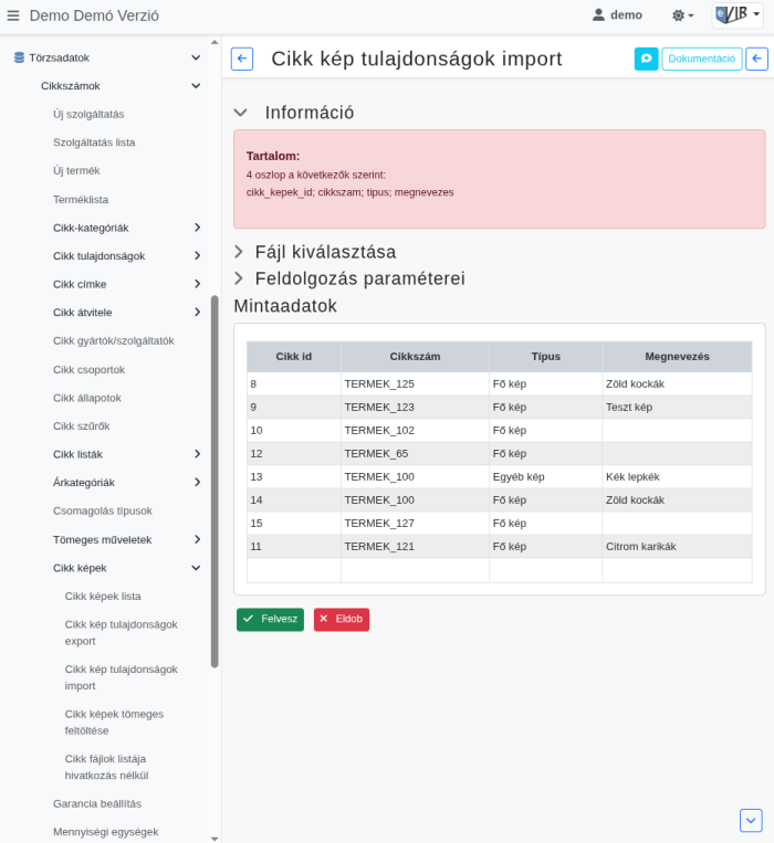A cikk kép tulajdonságok importálását a Törzsadatok → Cikkszámok → Cikk képek → Cikk kép tulajdonságok import menüpontban lehet elindítani.