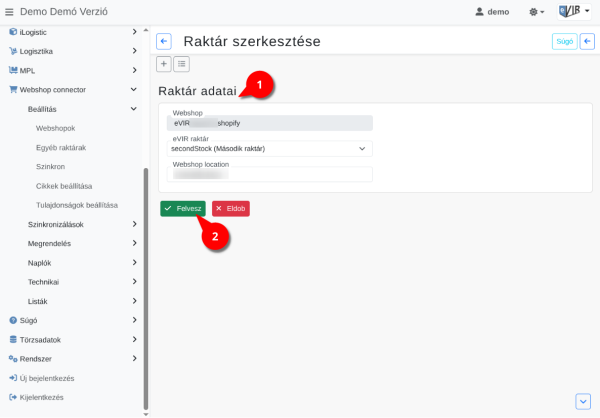 - A Webshop legördülőben ki kell választani a már rögzített webshopok közül, azt amelyikhez a megadott eVIR raktár készletét szinkronizálja a program.